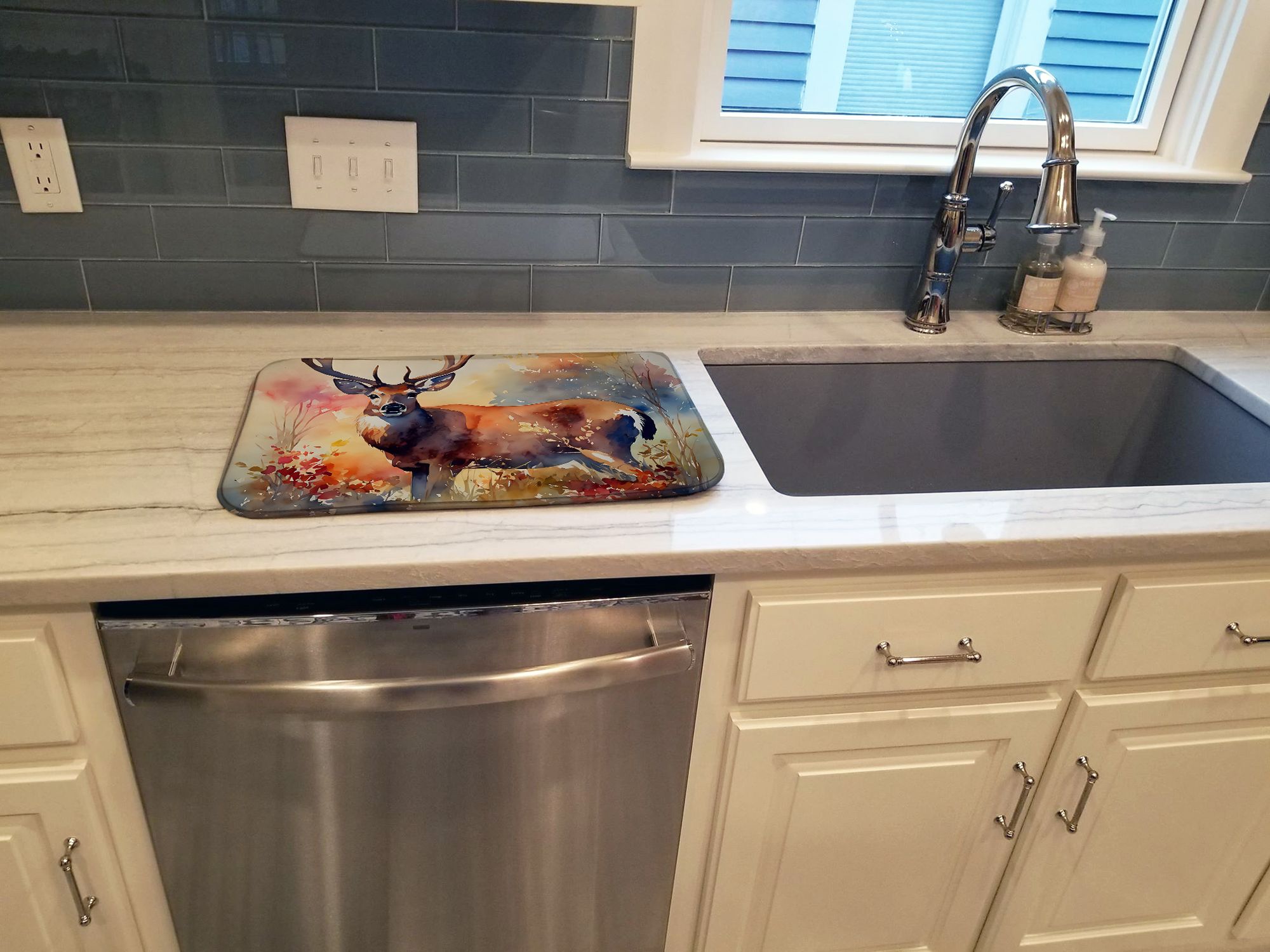 Dish Drying Mat featuring breed specific Deer artwork. Say goodbye to messy countertops and soggy dish towels with our innovative dish drying mat. Our high-quality dish drying pad is designed to keep your countertops dry while offering a stylish and efficient solution. Whether you're air drying dishes, glasses, stemware, silverware, pots, pans, bottles, or even fruits and vegetables, our dish mat is the perfect choice. The 14 inches x 22 inches size fits most counters and dish drying racks, and the non-slip design ensures stability. Made with water-absorbent polyester and a polyurethane foam insert, our dish drying mat is not only functional but also durable. It's machine washable and printed in the USA for long-lasting use. The beautiful artwork adds flair to your kitchen decor, making it a perfect housewarming gift or present for any occasion. Upgrade your kitchen experience with our absorbent and versatile dish drying mat.