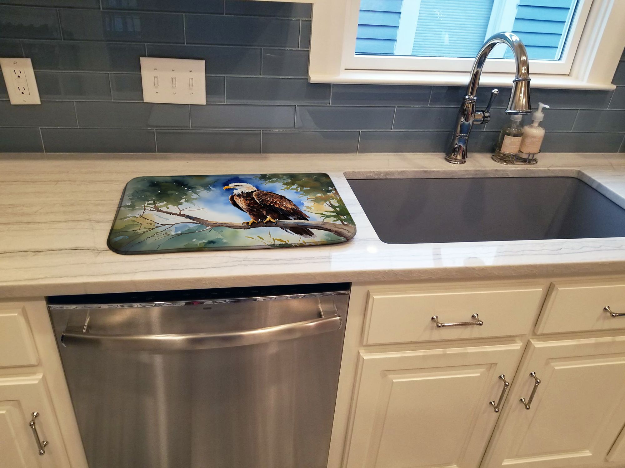 Dish Drying Mat featuring breed specific Eagle artwork. Say goodbye to messy countertops and soggy dish towels with our innovative dish drying mat. Our high-quality dish drying pad is designed to keep your countertops dry while offering a stylish and efficient solution. Whether you're air drying dishes, glasses, stemware, silverware, pots, pans, bottles, or even fruits and vegetables, our dish mat is the perfect choice. The 14 inches x 22 inches size fits most counters and dish drying racks, and the non-slip design ensures stability. Made with water-absorbent polyester and a polyurethane foam insert, our dish drying mat is not only functional but also durable. It's machine washable and printed in the USA for long-lasting use. The beautiful artwork adds flair to your kitchen decor, making it a perfect housewarming gift or present for any occasion. Upgrade your kitchen experience with our absorbent and versatile dish drying mat.