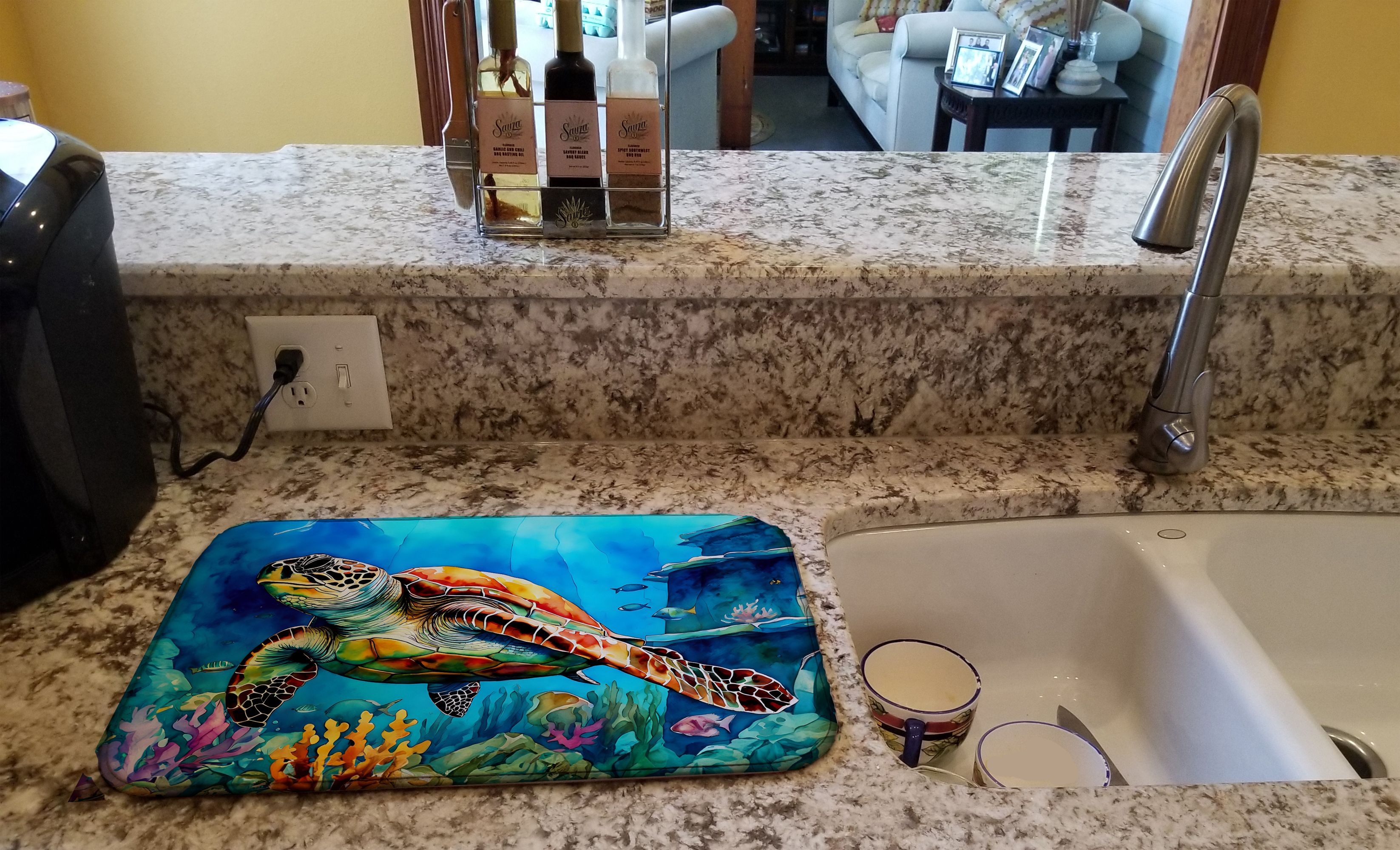 Dish Drying Mat featuring breed specific Loggerhead Sea Turtle artwork. Say goodbye to messy countertops and soggy dish towels with our innovative dish drying mat. Our high-quality dish drying pad is designed to keep your countertops dry while offering a stylish and efficient solution. Whether you're air drying dishes, glasses, stemware, silverware, pots, pans, bottles, or even fruits and vegetables, our dish mat is the perfect choice. The 14 inches x 22 inches size fits most counters and dish drying racks, and the non-slip design ensures stability. Made with water-absorbent polyester and a polyurethane foam insert, our dish drying mat is not only functional but also durable. It's machine washable and printed in the USA for long-lasting use. The beautiful artwork adds flair to your kitchen decor, making it a perfect housewarming gift or present for any occasion. Upgrade your kitchen experience with our absorbent and versatile dish drying mat.