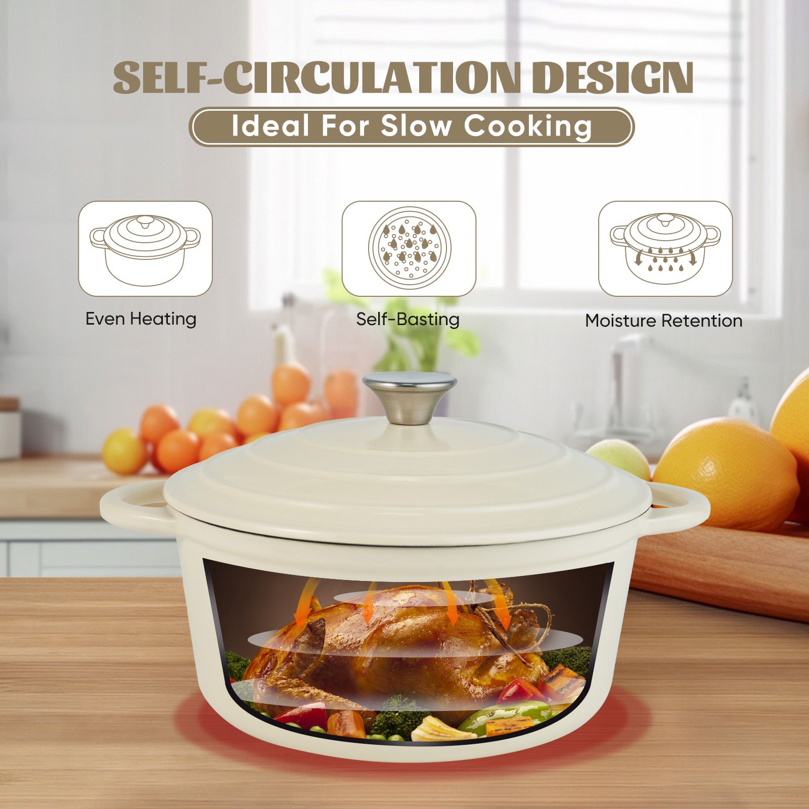 ��ENCLOSED THERMAL CIRCLE: This enameled dutch oven pot is design with circulating shower type lid, the raised design of the pot cover allows water vapor to circulate in the pot and locks the nutrition and moisture of the food, evenly fall on the food to maintain the original nutrition, possess pretty heat retention performance.