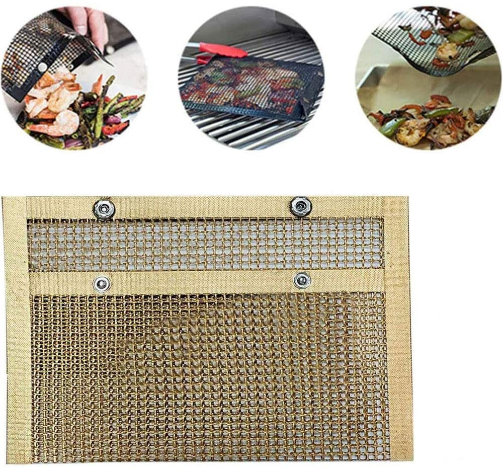 The non-stick material allows for easy removal of food afterwards, you just need to put the food in mesh bag, close it, and throw it on the grill. Snap fastener keeps your food securely in the bag.